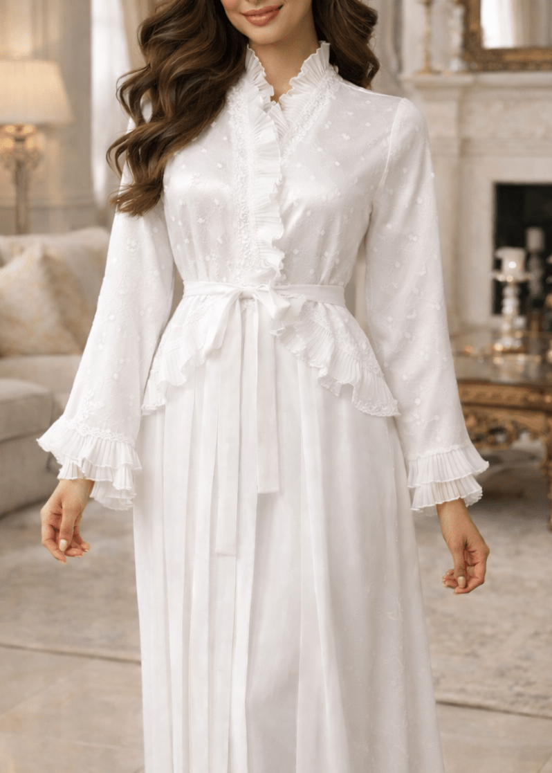 Satin home dress with a layer of chiffon and a touch of elegant plisse on the chest and sleeves. An elegant and soft design with distinctive lace and buttons at the chest for added comfort.