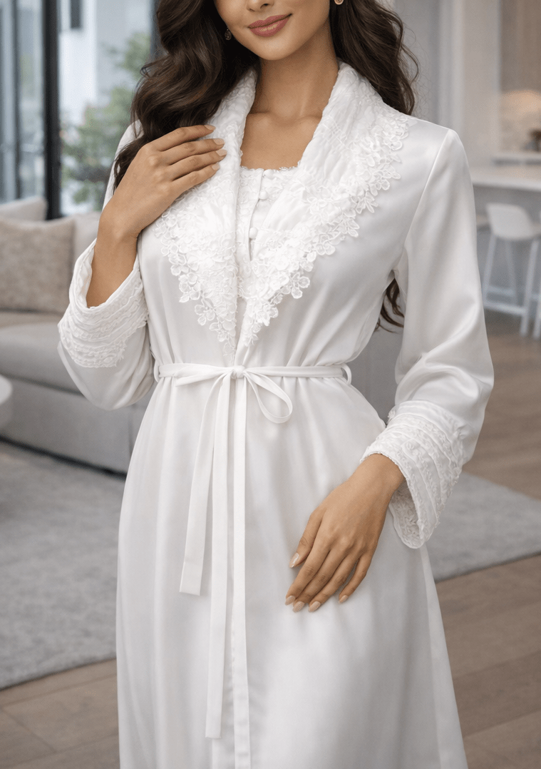Two-piece reception set consisting of a satin Dress and chiffon robe, with buttons at the chest for more comfort